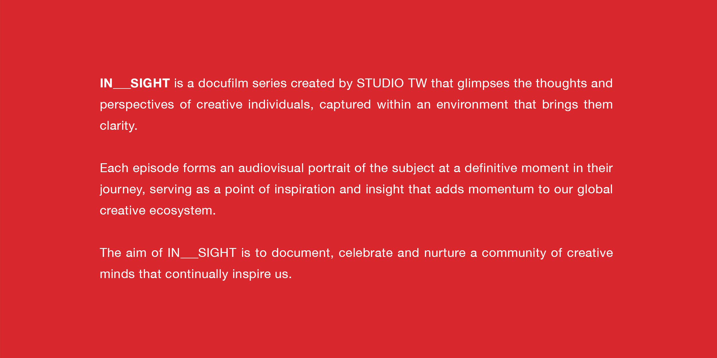 IN___SIGHT is a docufilm series created by STUDIO TW that glimpses the thoughts and perspectives of creative individuals, captured within an environment that brings them clarity.